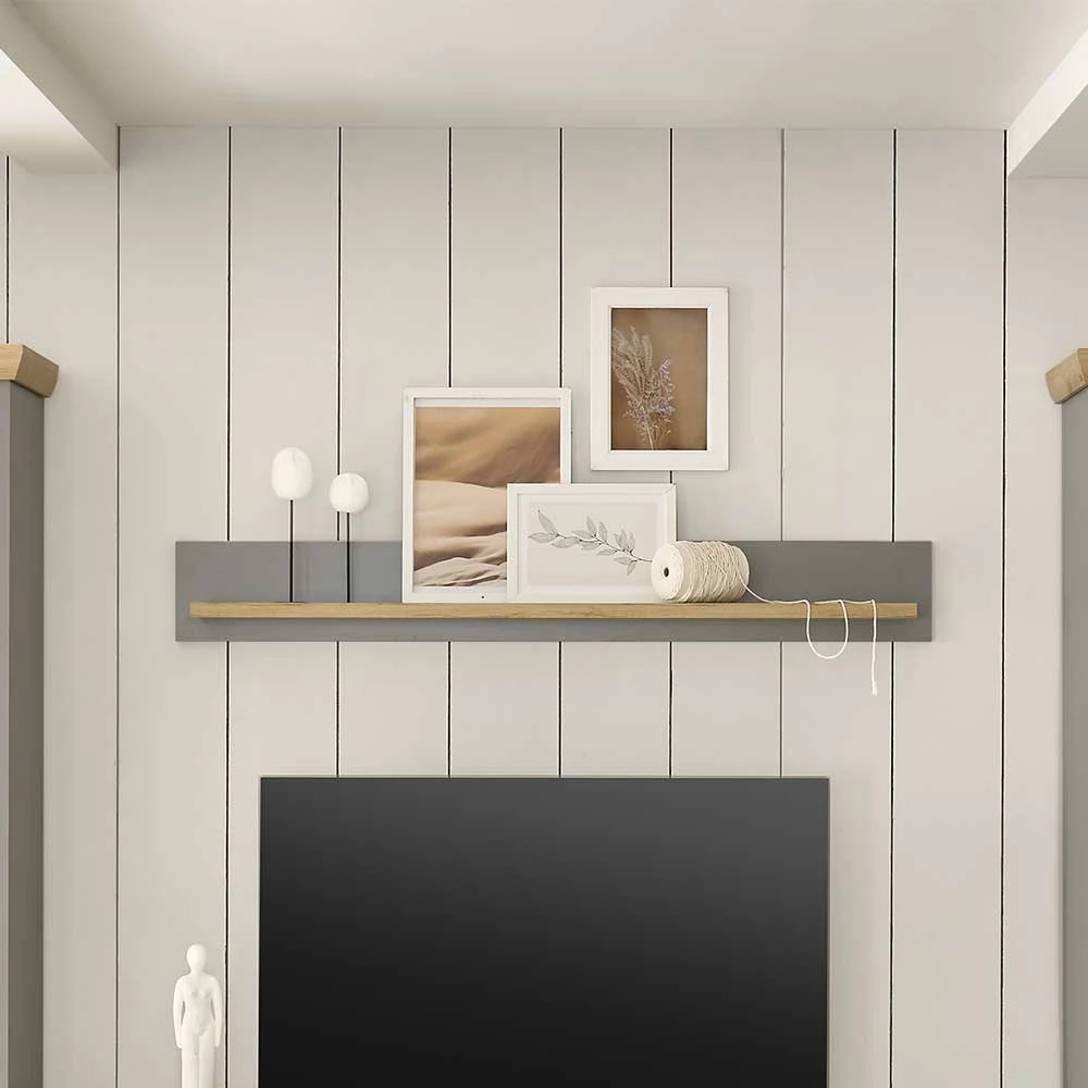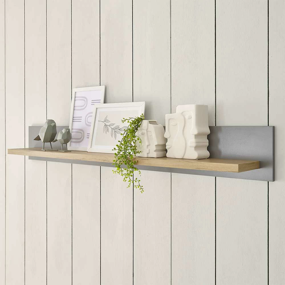 - Schlichtes Wandregal in Lichtgrau und Eichefarben