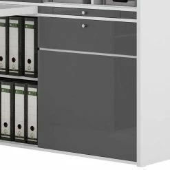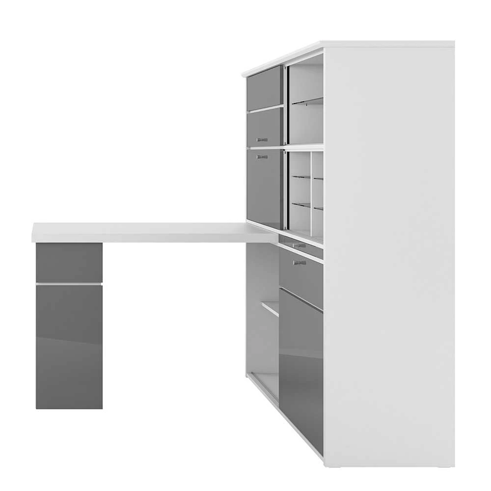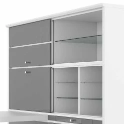 - Strapazierfähige Oberflächen durch Melaminbeschichtung in Grau und hochglänzend, wasser- und fettabweisend, kratzfest
