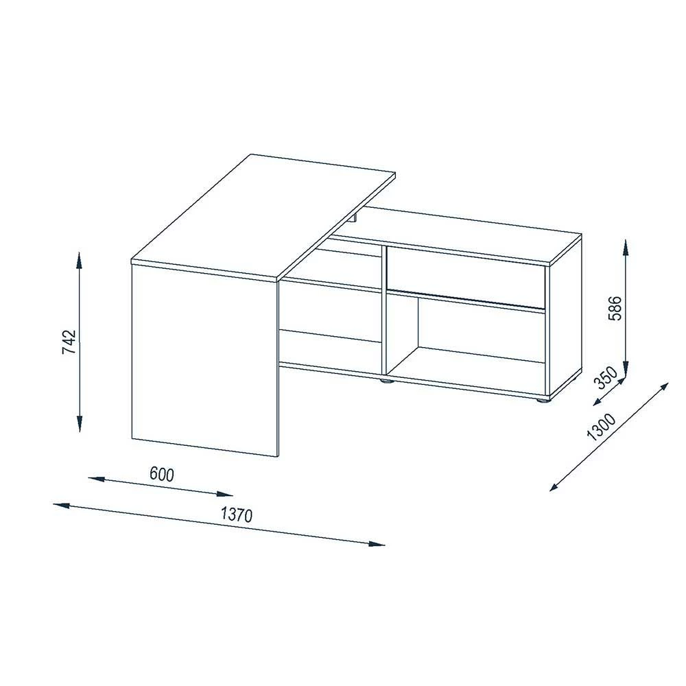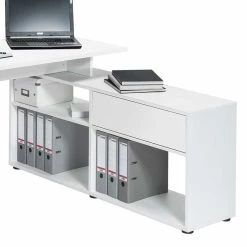 - Im seitlichen Regal zwei Fächer in Ordnerhöhe und ein niedriges Fach neben der Schublade